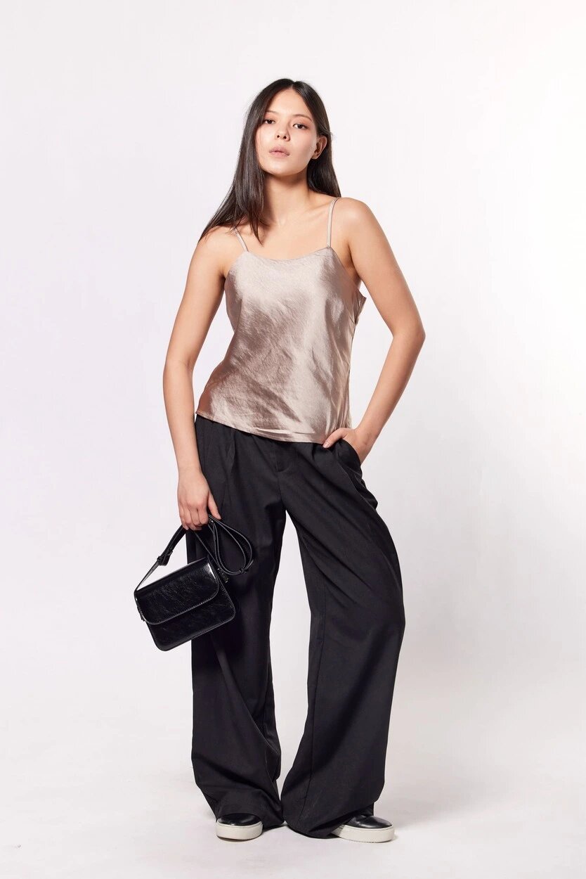 Элегантный сатиновый топ свободного кроя на тонких регулируемых бретелях, дополненный молнией на потайную молнию сбоку. Стильная и комфортная модель для создания офисного или вечернего образа.