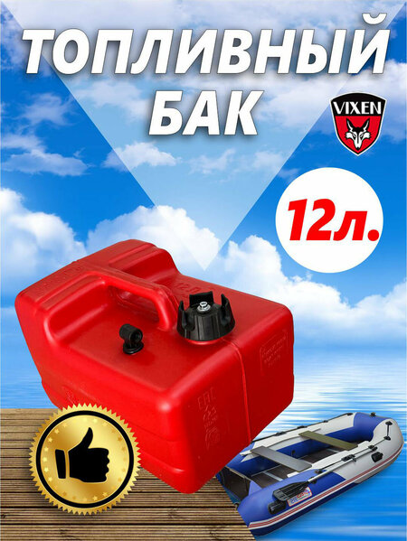 Топливный бак 12 литров, создан для хранения запаса топлива в любом транспортном средстве, садовом участке и доме. В пластиковой таре удобно хранить, использовать и перевозить ГСМ. Подключается к подвесному лодочному мотору через шланг с грушей и различными фитингами. Особенности: - Рекомендован для небольших навесных лодочных моторов, генераторов, триммеров, газонокосилок, бензопил, мини-тракторов, жидкотопливных котлов; - Изготовлен из высокоплотного маслобензостойкого полимера, который выдерживает температуры от -50C до +50С и стоек к воздействию вредных, химических веществ, ультрафиолета; - Универсальный "Г-образный" штуцер, позволит вкрутить адаптеры от шлангов ПЛМ разных/брэндов/мощности/тактности/года выпуска; - В патрубке предусмотрен топливный фильтр грубой очистки; - В стыках бака не уменьшается толщина пластика; - Толщина стенок, по сравнению с китайскими аналогами, увеличена на 50%; - Бак комплектуется крышкой из армированного стеклонаполненного полиамида, который, в отличие от китайских крышек из АБС пластика, выдерживает ударные нагрузки и вследствие чего, не будет подсасывать воздух; - Ручка сверху позволит удобно переносить бачок; Характеристики: Размеры: 35х25х23 см; Вес: 1.7 кг; Резьба в г-образном штуцере: 1/4 NPT; Объем: 12 литров; Заливная горловина: диаметр 50 мм; Цвет: красный; Рекомендации: При установке коннектора, выкручивании трубки подачи топлива необходимо использовать на соединении бензостойкий герметик. Также не рекомендуется усиленное затягивание элементов, т. к. это приведет к выводу из строя резьбы в пластиковых элементах и не позволит корректно работать уплотнению!