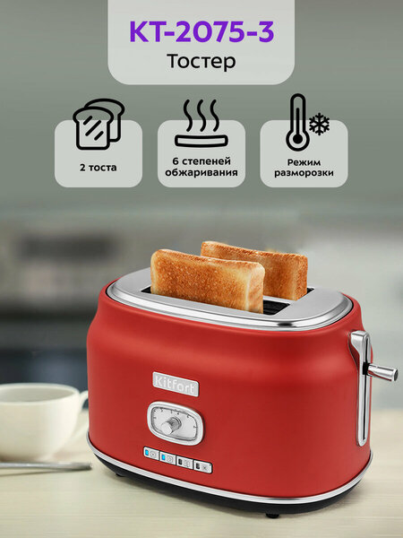 Электрический тостер Kitfort КТ-2075 создан для тех, кто любит полакомиться ароматным и хрустящим горячим поджаренным хлебом. Особый вкус и цвет корочки тостов получаются такими благодаря карамелизации сахара, содержащегося в муке, при инфракрасном нагреве в процессе приготовления. Тостер оснащен поворотным регулятором степени обжаривания и четырьмя кнопками со световыми индикаторами. Режим подогрева служит для подогрева уже готовых тостов, если они остыли. Режим разморозки позволяет приготовить тосты из замороженного хлеба. Режим Бейгл позволяет поджарить рогалики или другие мучные изделия, которые требуют более интенсивной прожарки. Благодаря широким слотам можно поджаривать толстые куски хлеба, а не только тонкие. Загруженные тосты автоматически центрируются, чтобы их обжарка с двух сторон была равномерной независимо от толщины куска. По окончании приготовления тостер автоматически отключается, а тосты поднимаются вверх, чтобы их было удобнее извлечь. Вы можете приготовить 1 или 2 тоста одновременно.