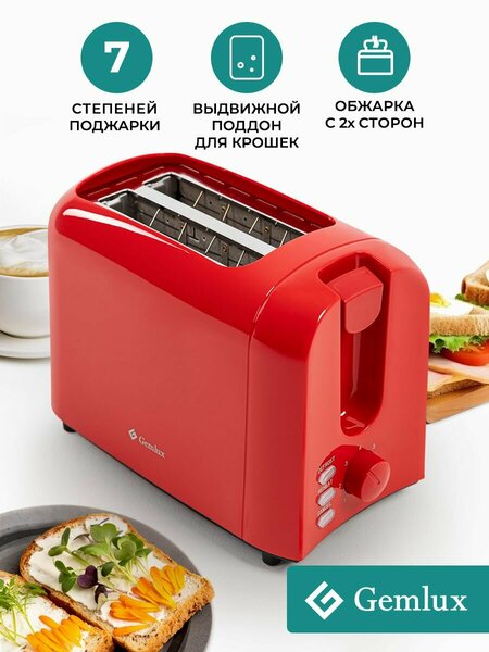 Компактный красный тостер для хлеба Gemlux GL-T210PR - это бюджетная техника для домашней кухни, бытовая техника для приготовления блюд из линейки Gemlux Basic. Он предназначен для поджаривания хлеба при приготовлении бутербродов и сэндвичей и поможет вам без особых затрат времени, сил и средств внести приятное разнообразие в ваш утренний завтрак. Два широких слота размером 13.6х3.2 см, глубиной 11.5 см оснащены фиксированными направляющими для тостов и позволяют равномерно обжаривать любые виды хлеба. Однако для получения наилучших результатов рекомендуем вам использовать специальный хлеб для тостов. В кухонном тостере предусмотрено 7 степеней обжарки и два дополнительных режима: размораживание хлеба и подогрев готовых тостов, а также возможность отмены всех операций (кнопка CANCEL). Кнопки выбора режимов имеют синюю светодиодную подсветку. Для упрощения процесса очистки тостерница оснащена выдвижным поддоном для крошек. Тостер для хлеба с поддоном легко хранить благодаря компактным размерам и наличию намотки для шнура на дне корпуса. Корпус кухонной техники изготовлен из прочного термостойкого пластика красного цвета. Тостер Gemlux станет отличным подарком на Новый год, 8 марта, день рождения и другие праздники.