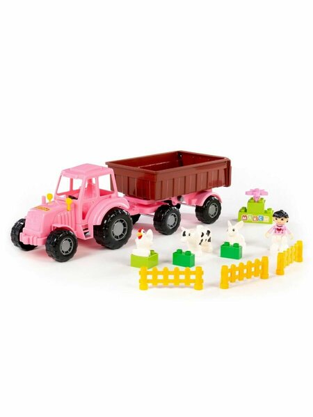 Яркий игровой набор «Ферма» от компании «Полесье». Подарите ребёнку возможность стать настоящим фермером с этим увлекательным игровым набором! В комплекте — всё для весёлых и полезных игр: стильный розовый трактор с прицепом «Мастер» и набор конструктора серии «Макси». Среди деталей конструктора — фигурки милых животных (курочка, коровка и кролик), заборчики, цветы для украшения фермы и фигурка девочки-помощницы. Малыш сможет придумывать бесконечные сценарии: возить грузы на тракторе, ухаживать за животными, строить загоны и создавать уютную ферму своими руками. Игра не только подарит часы радости, но и поможет развить воображение, внимание, мелкую моторику и познакомит с основами заботы о животных. Набор идеально подходит для сюжетно-ролевых игр как дома, так и на улице. Выполнен из качественных и безопасных материалов. Это прекрасный подарок для детей от 3 лет, который понравится и мальчикам, и девочкам, ведь мечтать о своей ферме можно вместе! В комплекте: трактор с прицепом, 13 элементов конструктора. Длина трактора с прицепом: 44 см.