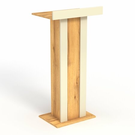 Конструкция оснащена столешницей перегородкой, за которой удобно расположить бумаги, микрофон и другие материалы для выступления. Внутри имеется полка, где можно расположить сопутствующие предметы для выступления.