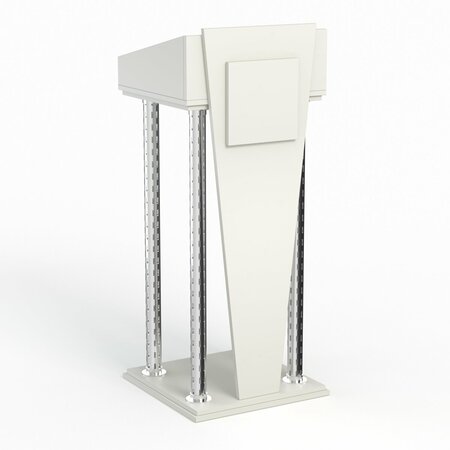 Трибуна для выступлений. Незаменимая вещь, когда надо провести мероприятие с большой аудиторией и оратором, будь то чтение лекции, бизнес форум, презентация или праздник. Изделие помогает акцентировать внимание на ораторе, сделать его речь более торжественной и запоминающейся. Трибуна оснащена столешницей с перегородками, где удобно поместить микрофон, текст речи, воду или иные необходимые вещи для произнесения речи, чтобы оратору было комфортно. Дополнительную прочность конструкции обеспечивают четыре металлические трубы, соединяющие подставку с основанием. На фасад трибуны можно установить нужный герб или логотип.