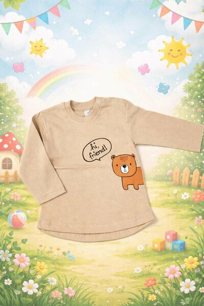 Детская трикотажная кофточка для малышей (6 и 9 месяцев) Милая и уютная кофточка для самых маленьких — идеальный выбор для повседневной носки. Модель выполнена из мягкого, приятного к телу трикотажа, который отлично подходит для нежной детской кожи и не вызывает раздражений. Кофточка имеет прямой удобный крой, не сковывает движений малыша и подходит как для сна, так и для активных прогулок. Длинные рукава защищают от прохлады, а круглая горловина с кнопками на плече позволяет легко и быстро надевать и снимать изделие, не причиняя дискомфорта ребёнку. Дизайн выполнен в нежном бежевом оттенке с очаровательным принтом в виде дружелюбного медвежонка и надписи “Hi, friend!”, что придаёт кофточке уютный и детский характер. Универсальный цвет легко сочетается с любыми штанишками, ползунками или джинсами. Преимущества модели: • мягкий и дышащий трикотаж • безопасный и комфортный крой • удобные кнопки для переодевания • нежный детский дизайн • подходит для дома и прогулок Размеры: • 6 месяцев • 9 месяцев Практичная, стильная и очень милая кофточка станет отличным элементом гардероба малыша и прекрасным вариантом для подарка