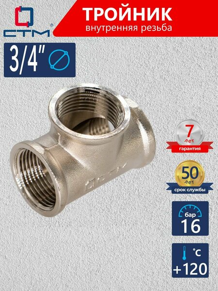 Тройник 3/4", резьба внутренняя, латунный для труб. Износостойкая никелированная латунь обеспечивает долгий срок фитинга службы и устойчивость к коррозии. Выдерживает высокое давление, подходит для сложных условий эксплуатации