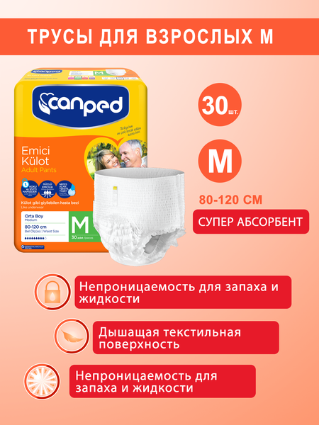 "Уверенность в каждом движении — подгузники в форме трусиков для активных взрослых, которым важно сочетание комфорта, впитываемости и свободы. Преимущества: Формат трусиков — легко надеваются и снимаются, как обычное бельё Надёжная впитываемость — до 2 литров жидкости Анатомическая посадка — комфорт без сползаний и натираний Дышащие материалы — циркуляция воздуха, защита от раздражений Контроль запаха — технология нейтрализации неприятных запахов Мягкий внутренний слой — подходит для чувствительной кожи Произведено в Турции — сертифицированное качество Назначение: для активных взрослых и пожилых людей при средней и тяжёлой степени недержания. Удобны при реабилитации, длительных поездках, уходе за подвижными пациентами. Размер: M (объём талии/бёдер 85–125 см) Уровень впитываемости: до 2000 мл Количество в упаковке: 30 штук Рекомендации по использованию: надевать как обычное нижнее бельё. Снимать — путём разрыва боковых швов. Менять по мере наполнения или каждые 6–8 часов. Использовать только по назначению. Условия хранения: хранить в сухом месте, вдали от прямого солнца и влаги.