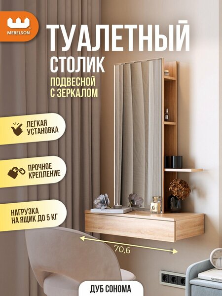 Подвесное трюмо "Мария" с зеркалом, полками и ящиком, ЛДСП Дуб сонома, Mebelson