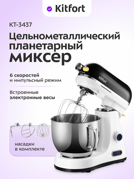 Многофункциональный цельнометаллический планетарный миксер КТ-3437 поможет вам смешать ингредиенты, взбить яичный белок или сливки, приготовить картофельное пюре, соус, крем, мусс, замесить жидкое тесто для блинов и крутое для пельменей и пирогов. При взбивании, смешивании или замешивании теста миксер может работать в автоматическом режиме. Вам достаточно положить ингредиенты, надеть насадку и включить прибор. У прибора 6 скоростей и импульсный режим. В комплекте к миксеру идут три насадки. Венчик служит для взбивания яичных белков, сливок, замешивания жидкого теста. Насадка для смешивания используется для негустых ингредиентов. Крюк для замешивания подойдёт для замешивания густого теста. Встроенные электронные весы позволяют взвешивать добавляемые ингредиенты. Вы можете взвешивать продукты в чаше, либо в другой ёмкости, поставив её вместо чаши. Чаша на 7 литров, выполненная из прочной нержавеющей стали, идеально подходит для смешивания горячих ингредиентов. Загрузочное отверстие позволяет добавлять компоненты без прерывания работы и поднятия моторного блока. Вам достаточно положить ингредиенты, надеть насадку и выбрать скорость работы. Прорезиненные ножки прочно фиксируют прибор на столе.