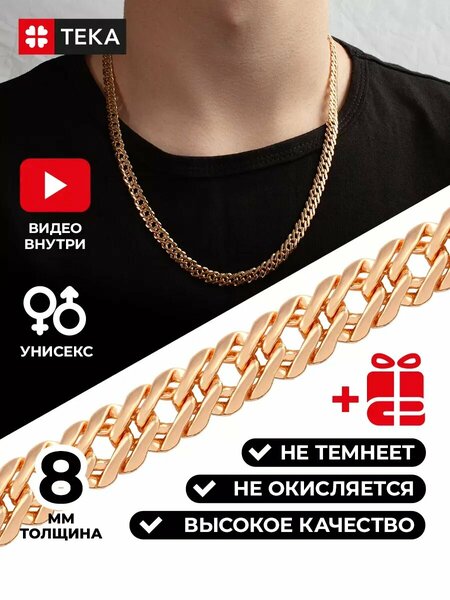 Модель унисекс подходит и для мужчин, и для женщин. Длина 50 и 60 см, ширина звеньев 8 мм. Классическое плетение Двойной ромб широкий всегда в тренде и удачно дополнит и мужской и женский образ. Надежный замок карабин. Вес изделия 32 гр. (для 50см) и 35 гр. (для 60 см). Это приятная тяжесть качественного украшения. Идеальный подарок для женщины. Жене, сестре, маме, любимой девушке. На день рождения, Новый год, 14 февраля, 8 марта или годовщину свадьбы. Модная и красивая бижутерия не требует примерки – подойдет всем девушкам без исключения и прекрасно дополнит образ, будь то выпускной, вечерний выход или просто стильный повседневный наряд. Недорогое милое украшение подойдет и как аксессуар подростку. Покрытие позолотой невозможно отличить от золотого украшения даже опытному ювелиру. Идеально отполированные звенья отражают свет и привлекают внимание. Можно подарить молодому человеку, парню, мужу или брату на 23 февраля или по любому другому поводу. Позолоченная цепь порадует вашего мужчину, независимо от его возраста. Широкая цепь создает элегантный мужественный вид. Поверхность, покрытая золотом, отшлифованная до зеркального блеска, придает бижутерии роскошный вид, визуально позволяет принять их за 100% ювелирные изделия. Замок-карабин доказал свою надежность и прочность. Нержавеющая ювелирная сталь, которую еще называют медицинское золото или дубайское золото, применяемая во всех украшениях TEKA, устойчива к царапинам, не подвержена ржавчине, не темнеет, не окисляется от воды или пота.
