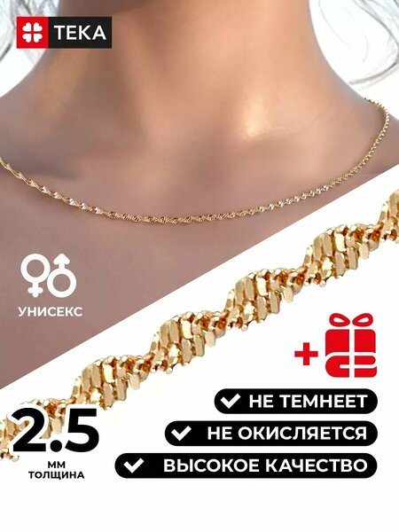 Цепочка женская под золото. Вес цепочки 5 гр. Изящное плетение Спираль всегда в тренде - удачно дополнит любой женский образ. Надежный замок карабин. Это нежное и изящное украшение. Идеальный подарок для женщины. Жене, сестре, маме, бабушке, любимой девушке. На день рождения, годовщину свадьбы или просто порадовать близкого человека. Модная и красивая бижутерия не требует примерки – подойдет всем девушкам без исключения и подчеркнет индивидуальность, будь то выпускной, вечерний выход или просто стильный повседневный наряд. Недорогое милое украшение подойдет и как аксессуар подростку. Покрытие позолотой невозможно отличить от золотой цепочки даже опытному ювелиру. Идеально отполированные звенья отражают свет и привлекают внимание. Поверхность, покрытая золотом, отшлифованная до зеркального блеска, придает бижутерии роскошный вид, визуально позволяет принять их за 100% ювелирные изделия. Замок-карабин, который используется в цепочках, годами доказал свою надежность и прочность. Высококачественный бижутерный сплав, который еще называют медицинское золото или дубайское золото, не подвержен ржавчине, не темнеет, не окисляется от воды или пота.