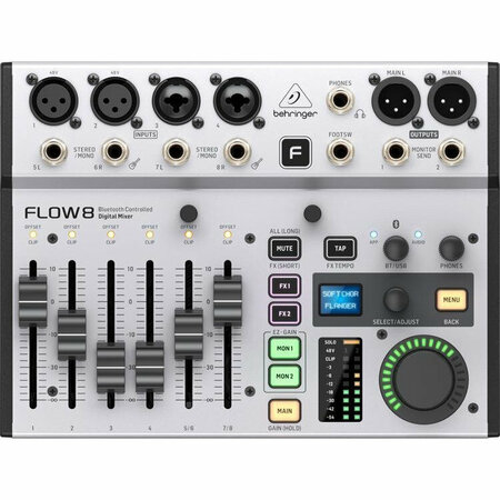 Behringer Flow 8 - цифровой микшер на 8 входов с Bluetooth-аудио и управлением приложениями, имеет 60-миллиметровые фейдеры каналов, 2 процессора FX и интерфейс USB/аудио