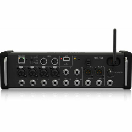 Цифровой микшер MR12 предназначен для сценического или студийного использования. Модель располагает четырьмя движками эффектов и двенадцатью аналоговыми входами, включая два инструментальных и четыре комбо с микрофонными преампами Midas Pro. Кроме того, встроен Wi-Fi-роутер, позволяющий удалено управлять микшером с мобильного устройства или ПК/ноутбука. Для этого применяются бесплатные приложения (имеются версии под iOS, Android, PC, Mac, Linux).
