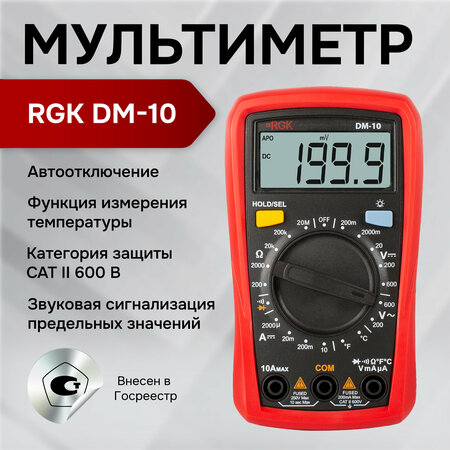 Цифровой мультиметр RGK DM-10 – это прибор для измерения различных параметров электросетей, диагностики оборудования, проверки диодов на работоспособность и прозвонки цепей. При подключении комплектной или любой другой термопары типа “К” эта модель может проводить замеры температуры вплоть до + 250ºС. За счет небольших размеров и легкости освоения основных функций, мультиметр станет отличным выбором для домашнего использования. Ключевые преимущества Измерение, силы постоянного тока, напряжения, сопротивления, температуры. Разрядность измерительной шкалы 3 ½. Категория защиты от перепадов напряжения CAT II 600 В. Кнопка HOLD для фиксации значений на экране. Подсветка дисплея. Удобное и быстрое переключение между режимами. Измерительные провода, щупы и термопара для замера температуры до 80ºС в комплекте. При работе с портативным мультиметром RGK DM-10 предел измерений определяется вручную. Показания выводятся на экран крупным, легко различимым шрифтом и обновляются 2-3 раза в секунду. Звуковая сигнализация, которая активируется при достижении предельных значений 600В/10А на входных каналах, может уберечь как прибор, так и оператора. При проверке диодов предусмотрена отдельная индикация для тех тестовых ситуаций, когда цепь с объектом проверки разомкнута, или он подключен в обратном направлении. В целях экономии заряда батарей, в прибор встроена функция автоотключения через 15 мин. бездействия. Обслуживание устройства не требует специальных знаний и больших временных затрат. Для всех рутинных операций, таких как замена элементов питания или предохранителей, не требуется ничего кроме отвертки и инструкции.