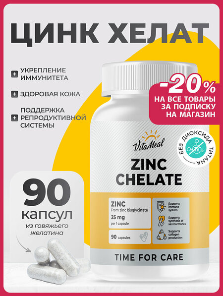 VitaMeal Zinc Chelate - это источник цинка в форме бисглицината, с витамином А и витамином В6, в капсулах.