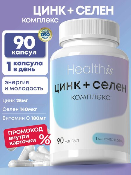 Цинк Селен с витамином С от Healthis — сбалансированный комплекс для иммунитета, энергии и красоты. Подходит как мужчинам, так и женщинам. Как работает БАД: Цинк и селен — мощные антиоксиданты, которые работают в паре. Цинк цитрат легко усваиваются, укрепляет иммунитет, улучшает состояние кожи, волос и ногтей. Селен защищает клетки от стресса и поддерживает щитовидную железу. Эффект от приема: • Укрепляет иммунитет — помогает справляться с вирусами • Для мужчин: поддерживает потенцию и уровень тестостерона (цинк для мужчин для потенции) • Для женщин: улучшает кожу и снижает воспаления (цинк селен для женщин) • Снижает усталость, ускоряет восстановление Преимущества: • Оптимальное сочетание цинка и селена в легкоусвояемых формах • Подходит всем — цинк селен витамины для мужчин и женщин • Удобный приём — 1 таблетка в день Рекомендации по применению: 1 таблетка в день во время еды. Дозировка: 25 мг Цинка, 140 мкг Селена, 180 мг Витамина С Гарантия качества: Все комплексы Healthis проверены и соответствуют стандартам безопасности. Ваше здоровье — наш приоритет. Проверка подлинности: Отсканируйте QR-код на упаковке через приложение «Честный знак». С заботой, команда Healthis