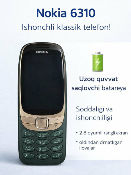 {"widgets":{"@card/UniversalPromoBadge":{"/content/page/fancyPage/defaultPage/universalPromoBadge":{"wrapperProps":{"margins":{"bottom":"3"}},"initialTime":1771451639267,"offerComposeId":"5984673418839602897"}}},"meta":{"/content/page/fancyPage/defaultPage/universalPromoBadge":{"name":"@card/UniversalPromoBadge"}},"collections":{"productServiceSnippets":{"5984673418839602897":{"productSnippet":{"snippetId":"document_id","type":"MODEL_CARD_LAYOUT","productPayload":{"snippetStyle":"NORMAL","title":{"value":"Телефон Savdo \"Tugmali\" Nokia 6310, Android, 2 SIM, FM-радио"},"badges":{},"price":{"actualPrice":{"amount":{"intPart":299000,"currency":"UZS"},"style":"RED","type":"OTHER_DISCOUNT"},"oldPrice":{"amount":{"intPart":480000,"currency":"UZS"},"style":"STRIKETHROWED"}},"gallery":{"mediaItems":[{"picture":{"baseUrl":"https://avatars.mds.yandex.net/get-mpic/16136863/2a0000019c2791767eafb9d95bfb366e6067/","width":1080,"height":1440,"title":"Телефон Savdo \"Tugmali\" Nokia 6310, Android, 2 SIM, FM-радио"},"type":"IMAGE"},{"picture":{"baseUrl":"https://avatars.mds.yandex.net/get-mpic/17640514/2a0000019c6a4848b86ec4b889e692478f0b/","width":1080,"height":1440,"title":"Телефон Savdo \"Tugmali\" Nokia 6310, Android, 2 SIM, FM-радио"},"type":"IMAGE"},{"picture":{"baseUrl":"https://avatars.mds.yandex.net/get-mpic/16396243/2a0000019c6a4848b7556b2a61ffd5ec2b4b/","width":1080,"height":1440,"title":"Телефон Savdo \"Tugmali\" Nokia 6310, Android, 2 SIM, FM-радио"},"type":"IMAGE"},{"picture":{"baseUrl":"https://avatars.mds.yandex.net/get-mpic/17741937/2a0000019c6a4848b840447713a514ee7820/","width":1080,"height":1440,"title":"Телефон Savdo \"Tugmali\" Nokia 6310, Android, 2 SIM, FM-радио"},"type":"IMAGE"},{"picture":{"baseUrl":"https://avatars.mds.yandex.net/get-mpic/14770882/2a0000019b42d64db1762a28792a42ee3ba6/","width":1080,"height":1440,"title":"Телефон Savdo \"Tugmali\" Nokia 6310, Android, 2 SIM, FM-радио"},"type":"IMAGE"},{"picture":{"baseUrl":"https://avatars.mds.yandex.net/get-mpic/15042144/2a0000019b42d64db1ccebf24f9fff2d0dcd/","width":1080,"height":1440,"title":"Телефон Savdo \"Tugmali\" Nokia 6310, Android, 2 SIM, FM-радио"},"type":"IMAGE"},{"picture":{"baseUrl":"https://avatars.mds.yandex.net/get-mpic/16431210/2a0000019c6ac7507f91337428b321dff842/","width":500,"height":500,"title":"Телефон Savdo \"Tugmali\" Nokia 6310, Android, 2 SIM, FM-радио"},"type":"IMAGE"}]},"wishlistButton":{"businessId":216677692,"mskuId":5146344137,"modelId":5146344136,"oskuId":5146344137,"offerId":"40WwYyQi6lqpWXlxYf2fPA"}},"baobabPayload":{"type":"offer","wareId":"40WwYyQi6lqpWXlxYf2fPA","modelId":5146344136,"marketSku":"5146344137","snippet_type":"product","isExpress":false,"price":480000,"additionalPrices":[{"priceType":"withDiscount","priceValue":299000},{"priceType":"unknown","priceValue":480000}],"hid":91491,"shopId":431782,"shopSku":"MRKT-JTXMCL0H","supplierId":216677691,"supplierType":3,"isUltima":false,"oskuId":5146344137,"snippetTheme":"GRID_FULL","stockCount":100,"promoLogJoinId":"e5a7b37952e01360eda488027b8464c7/3950ab21e2c9a0fe"},"themeType":"GRID_FULL"}}}}}