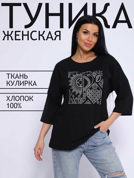 Женская стильная укороченная туника свободного кроя из мягкого однотонного трикотажного полотна, 100% хлопка. На полочке — принт с использованием глиттера и техники объёмной печати. рукава длиной 3/4 на спущенном плече, горловина просторная с притачной бейкой из основной ткани. Обработка деталей вкруговую с закрепкой. Низ и рукава подшиты вподгибку. Большие размеры. Размер/длина в см: 48/71; 50/71; 52/72; 54/72; 56/73; 58/74; 60/75; 62/76; 64/77; 66/78. Кулирка (кулирное полотно, кулирная гладь) — это самое тонкое и гладкое трикотажное полотно, изготовленное на основе чистого хлопка. Полотно имеет характерную структуру: с лицевой стороны плоские «косички», с изнаночной — «кирпичная кладка». Особенности материала: гипоаллергенность, мягкость, гигроскопичность, комфорт при носке. При стирке возможна усадка. Материал: Кулирное полотно. Состав: 100% хлопок.