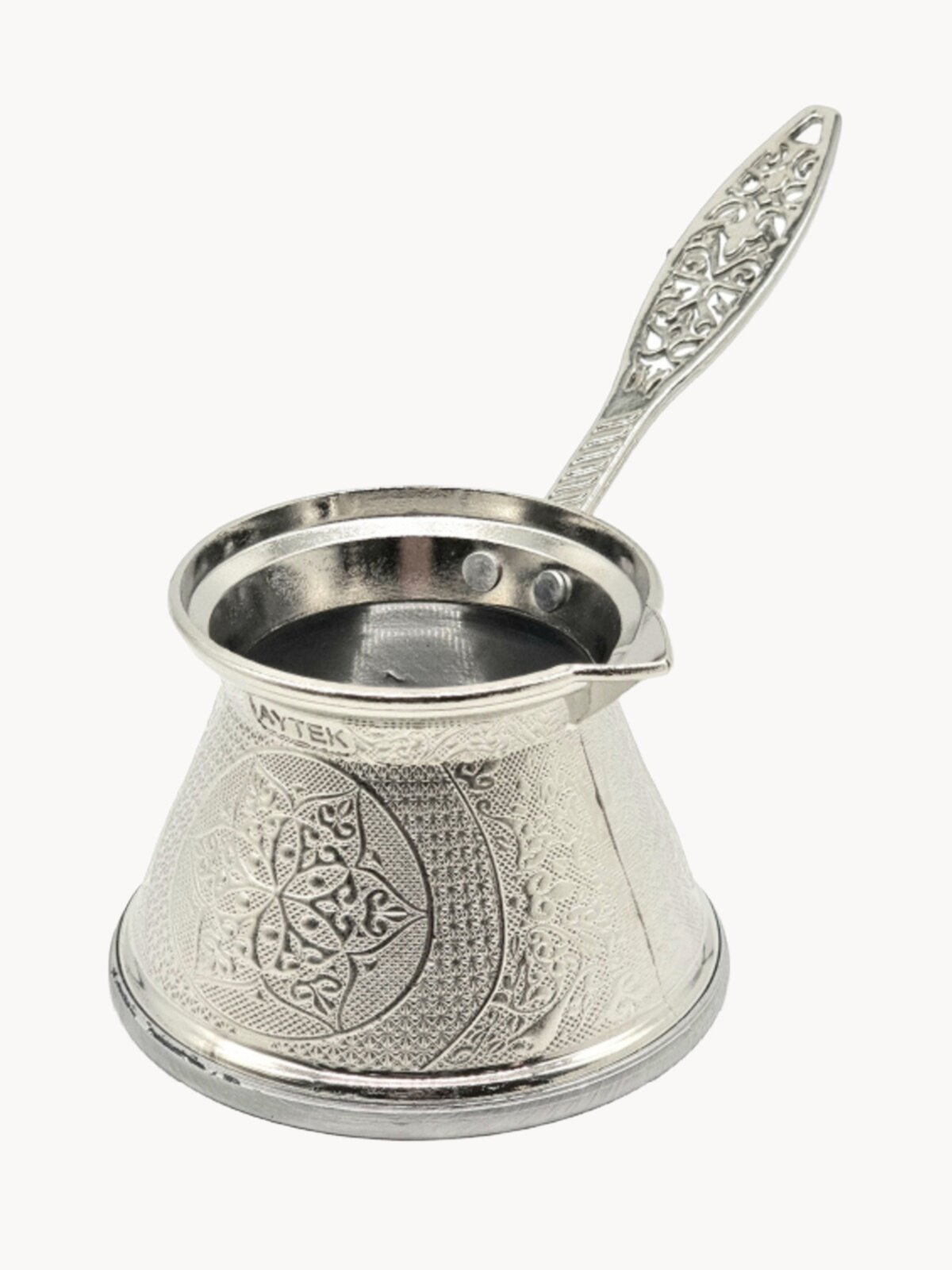 Посуда в восточном стиле отличается богатым внешним видом и продуманностью формы, материала и размеров. Цвет: серебро Наша турецкая джезва (турка), выполнена из цинкового сплава-Zamak. Благодаря этому уникальному материалу производитель может добиться тончайшего изысканного узора, который передает волшебную атмосферу Востока! Внутренняя часть турки изготовлена из пищевой нержавеющей стали. Готовить кофе нужно на слабом огне. Турка имеет удобную металлическую ручку, благодаря надежному креплению и особой конструкции она выдерживает многократное нагревание. Перед применением обязательно помойте турку и несколько раз вскипятите в ней воду, после чего можно варить кофе. Такая джезва станет прекрасным подарком для ваших близких. Турку можно использовать с любого вида плитами, в том числе она подходит для индукционной плиты! Также можно варить кофе на песке! Рекомендации по уходу: Не мойте в посудомоечной машине. Не оставляйте во влажной среде. Используйте легкие чистящие средства без абразива. Информация для владельцев индукционных плит Диаметр дна у данной турки менее 12 см. У многих индукционных плит стоит защита от срабатывания при диаметре посуды менее 12 см. Вы можете «обмануть» плиту, поставив одновременно две турки, либо поставив на эту конфорку край другой индукционной посуды (например кастрюли с водой). Также вы всегда можете вернуть данную турку в стандартные сроки возврата Характеристики: Объем: 180 мл Рабочий объем: 170 мл Диаметр дна: 9 см. Диаметр горлышка 6,5 см Габариты: 100х160х75мм Вес: 215 гр.