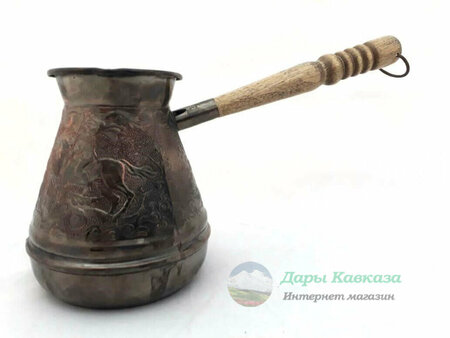 Турка для кофе на 500 мл. Изготовлена из настоящей меди толщиной 1 мм. Прекрасно варит кофе и держит температуру. С удобной деревянной ручкой. Сделано в России (Ставропольский край).