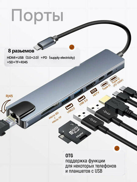 Док-станция увеличит количество разъемов устройства, будь то смартфон, ноутбук или планшет. Обеспечивает возможность подключения аксессуаров. Подсоединяете и получаете полноценное рабочее место с внешним монитором или телевизором, клавиатурой и мышью, сетевым кабелем. Хаб 8 в 1 расширяет функционал компьютера и конечно же телефона. Интерфейсы: считывает флешки. Подключайте интернет через lan сетевой кабель (ethernet). Обеспечен картридером (Card reader), читает SD и Micro SD. Поддерживает большинство типов быстрых зарядок USB-PD, Quick Charge и др. ipad или другой смартфон заряжает с максимальной скоростью.