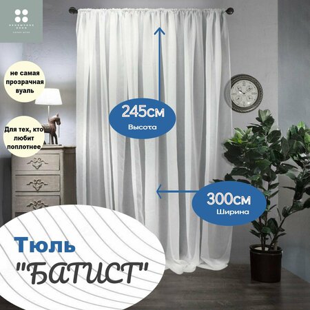 Батист - это тонкая, полупрозрачная и очень мягкая ткань, которая производится для тюли из волокон полиэстера, но очень похожих на хлопок. Батистовые шторы – это роскошно! Мягкие батистовые шторы создают уютную атмосферу в комнате, добавляют ей элегантности и стиля. Они также защищают от солнечных лучей и создают приятную прохладу в жаркие дни.