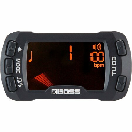 Boss TU-03 – точный хроматический тюнер и многофункциональный метроном. Это компактное и простое в использовании устройство «два в одном», выполненное в корпусе с клипсой. Последнюю, снабженную подкладкой, можно закрепить на головку грифа почти любого струнного инструмента.