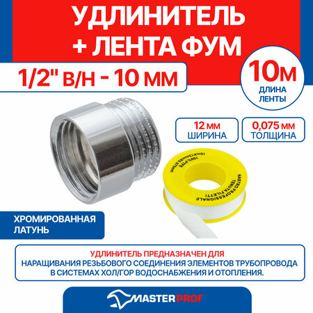 Состав комплекта: Удлинитель - 1 шт; Лента ФУМ - 1 шт. Удлинитель предназначен для наращивания резьбового соединения элементов трубопровода в системах хол/гор водоснабжения и отопления. Удлинитель имеет корпус круглого сечения с внутренней и наружной резьбами. Для получения герметичного соединения со стороны резьбового элемента при установке соединителя необходимо использование ленты ФУМ. Соединение получается разъемным, что позволяет при необходимости произвести обслуживание участка трубопровода, кроме того, возможно повторное использование фитинга. Замоноличивание разъемных соединений в строительные конструкции - недопустимо. Фитинг сделан из латунного сплава, благодаря минимальному содержанию свинца в сплаве, фитинг подходит для использования в системах питьевого водоснабжения. Для защиты от коррозии и придания изделию эстетичного вида как на наружную, так и на внутреннюю поверхности фитинга нанесено гальваническое хромированное покрытие. Размер резьбы 1: 1/2", Тип резьбы 1: внутренняя, Размер резьбы 2: 1/2", Тип резьбы 2: наружная, Длина: 10 мм, Метод изготовления: горячая штамповка, Материал корпуса: латунь CW617N, Внешнее покрытие: хромированное гальваническое антикоррозионное, Рабочая температура: от -10°C до +100°C, Рабочее давление: до 6 Bar (0,6 МПа), Рабочая среда: вода, пар, сжатый воздух и другие среды не агрессивные к материалам изделия.