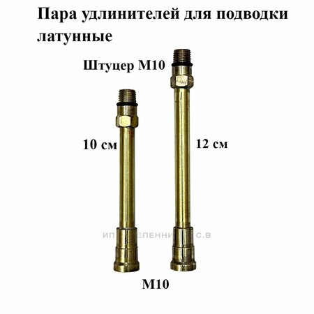 Удлинитель для подводки латунный М10 (пара)- 2 штуки Латунный удлинитель состоит из латунной трубки, гайки, штока и резиновой уплотнительной прокладки. Используется для увеличения длины посадочных отверстий и удобства монтажа подводки к смесителю с углубленным корпусом и в труднодоступных местах. В комплекте - 2 штуки. Характеристики: Тип – удлинитель для подводки смесителя Подключение – гайка М10х1 мм, – шток М10х1 мм Длина – 10\12 см Давление - 5мПа Максимальная температура – 110с* Материал – Латунь Производство – Россия
