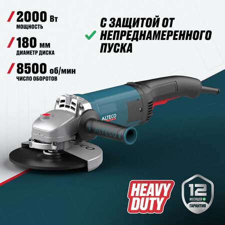 Угловая шлифмашина ALTECO Heavy Duty AGH 2000-180 разработана для профессиональной резки, шлифовки и зачистки твердых материалов в условиях интенсивной эксплуатации. Оснащенная мощным двигателем на 2000 Вт, диском диаметром 180 мм и скоростью вращения до 8500 об/мин, она обеспечивает стабильную производительность даже при выполнении самых требовательных задач. ALTECO AGH 2000-180 — надежный инструмент Heavy Duty-серии, уверенно справляющийся с максимальными нагрузками и предназначенный для самых тяжелых видов работ.