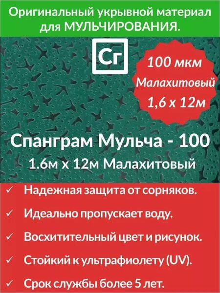 Укрывной материал спанграм МУЛЬЧА-100 1,6х12м малахитового цвета предназначен для мульчирования почвы и защиты от сорняков. Современный материал прекрасно пропускает воздух и влагу и не пропускает солнечный свет. Сочетание этих двух качеств позволяет материалу спанграм МУЛЬЧА-100 эффективно бороться с ростом сорняков на Вашем садовом участке. Изготовлен в приятном темно- зеленом цвете с фактурным рисунком в виде искр. Преимущества: • Эффективно замедляет рост сорняков, • пропускает воздух и воду, • не образует конденсат, препятствует возникновению парникового эффекта, • придает грядкам эстетический внешний вид. Использование: Положите спанграм МУЛЬЧА-100 на предварительно вскопанную и прополотую почву. Прорежьте отверстия для растений. Поливайте прямо через материал.