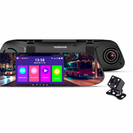 TrendVision Prime Mirror - новинка 2024 года! Бюджетный видеорегистратор-зеркало от известной компании TrendVision, которая уже больше 10 лет занимается отечественной разработкой видеорегистраторов специально для России и стран СНГ. 2 камеры (передняя Full HD и задняя HD) Умные датчики (удара G-сенсор и движения) Парковочный режим Гибкая настройка кнопок под необходимые функции Функция "ScreenSaver" - погашение дисплея через выбранное время HDR-режим Ночной режим Отображение любой из камер (или обеих камер одновременно) Яркй IPS-дисплей 5 дюймов При подключении задней камеры к бортовой системе автомобиля, при включении заднего хода, автоматически задняя камера отображается на экране с парковочными линиями и включается светодиодная подсветка, размещенная прямо на задней камере. Поддержка карт памяти до 128 Gb, Повышенный угол обзора 150 градусов у передней камеры И многое другое.