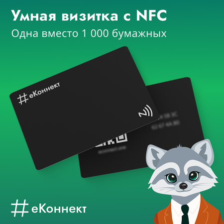 Бесконечная цифровая визитка Еконнект является отличным атрибутом делового человека. Smart-визитка имеет стандартные размеры банковской карты 85х55мм и легко помещается в бумажник или карман. С её помощью можно в одно касание передать контактные данные своему собеседнику (NFC-технология или QR-код). Социальные сети, номер телефона, почта и другие сервисы в одно касание у нового друга! Карта уже запрограммирована, но её нужно активировать. Алгоритм активации карты: 1. Приложить визитку к телефону / отсканировать QR-код 2. Зарегистрировать свой email и ввести пароль (это действие нужно выполнить один раз, затем при прикладывании будет открываться ваш электронный профиль) 3. Заполнить свой профиль контактной информацией (ФИО, телефоны, почты, ссылки на социальные сети и сайты) 4. Наслаждаться использованием умной визитки и делиться своей информацией за одну секунду! В тариф "Эконом" входит 6 месяцев подписки на сервис, далее вы можете продлевать подписку на сайте всего за 50 руб. в месяц. Умная визитка будет отличным подарком на Новый Год, Рождество, 23 февраля и 8 Марта, а также отличный вариант для корпоративов и сюрпризов коллегам. Знакомься! Делись! Удивляй!