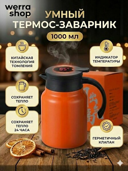Умный термос-заварник для чая с индикатором температуры, 1000 мл Откройте для себя новый уровень чаепития ✨ Этот умный термос-заварник создан для тех, кто ценит вкус, комфорт и эстетику в каждой детали. Благодаря встроенному индикатору температуры вы всегда знаете, когда напиток готов к употреблению — идеальная температура без догадок. Специальная система китайского томления позволяет чаю и травам раскрывать вкус и аромат постепенно, делая напиток насыщенным и мягким. Термос надежно сохраняет тепло до 24 часов, поэтому горячий чай будет радовать вас дома, в офисе или в дороге. Герметичная крышка предотвращает протекание, а удобная ручка делает использование максимально комфортным. Стильный дизайн и объем 1000 мл делают этот термос идеальным выбором для ежедневного использования и приятным подарком для близких. Преимущества: Индикатор температуры на крышке Объем 1000 мл Сохраняет тепло до 24 часов Система заваривания и томления чая Герметичный клапан, защита от протеканий Подходит для чая, травяных сборов и напитков Наслаждайтесь вкусом настоящего чая — долго, тепло и с удовольствием