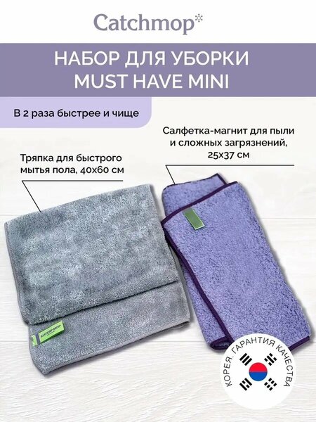 Универсальный набор для уборки из Кореи, который поможет сделать уборку быстрой, приятной и безопасной. _Состав набора MUST HAVE: Многофункциональная салфетка для уборки-1 шт, Тряпка для мытья полов-1 шт, салфетка для мытья стекол и зеркал-1 шт._Состав набора MUST HAVE MINI: Тряпка для мытья полов - 1 шт, салфетка для мытья стекол и зеркал-1 шт._Салфетки Catchmop для мытья пола, кафеля, мебели и других гладких и фактурных поверхностей от пыли и грязи. Можно использовать как насадки для швабры Catchmop. В сухом виде идеально захватывает и удерживает пыль, шерсть, волосы. Во влажном виде отлично справляется с въевшимися пятнами. Можно использовать в сухом и влажном виде. И все это-без бытовой химии и вреда для вашего здоровья и красоты рук. Корейская безворсовая многоразовая салфетка для мытья стекол и зеркал подходит для повседневной уборки на кухне, в ванной и других помещениях. Можно использовать в сухом и влажном виде. Благодаря антистатическому эффекту легко справляется с загрязнениями эффективнее чем аналоги из микрофибры хлопка и нетканого материала. Убирает следы пальцев, брызг, воды и жира на глянцевых поверхностях, придавая им блеск и сияние. Подходит для мытья окон, зеркал, экранов компьютеров, телевизоров и гаджетов, полировки столовых приборов и хрусталя, чистки серебра. Эффективна даже без применения бытовой химии и чистящих средств. Незаменимый помощник для уборки квартиры дома дачи и офиса. Все салфетки изготовлены их уникального запатентованного микроволокна Catchmop. Волокна CATCHMOP в 100 раз тоньше человеческого волоса-Особая структура микроволокна проникает в мельчайшие поры, быстро удаляя всю грязь без использования бытовой химии, не царапая поверхности.- Волокно имеет антибактериальные свойства. Можете не переживать, в нем не будут размножаться бактерии, как в других тряпках.-Срок службы салфеток и губок до 500 стирок. Просто ополосните под водой, постирайте при температуре не выше 40С. Международный эко-сертификат LOHAS. Произведено в Корее.