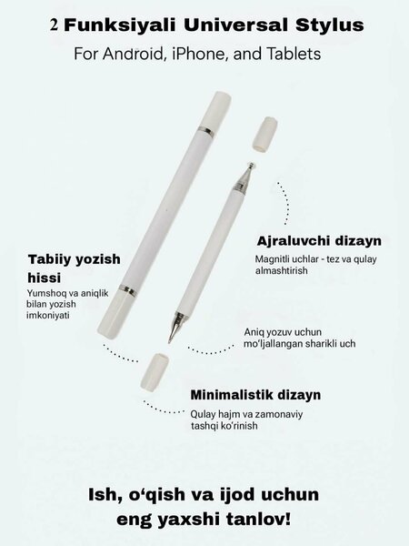 Универсальный стилус с 2 функциями – для Android, iPhone и планшетов Модель: 2-в-1 стилус (сенсорный стилус и шариковая ручка) Совместимость: Подходит для всех сенсорных устройств – Android, iOS, планшеты, iPad и др. Основные характеристики: Естественное письмо: Мягкое и точное письмо на экране Съемный дизайн: Магнитные наконечники – удобно и быстро менять Шариковый наконечник: Подходит для бумажных записей Минималистичный внешний вид: Стильный и компактный дизайн Материал: Легкий металлический корпус Цвет: Черный Размер: Около 14 см – удобно держать в руке Преимущества: Идеально для учебы, работы и творчества Улучшает точность письма на экране Не царапает экран Не требует зарядки (без батареи) Рекомендуется для: студентов, дизайнеров, офисных работников, писателей и для повседневного использования Лучший выбор для учебы, работы и творчества!