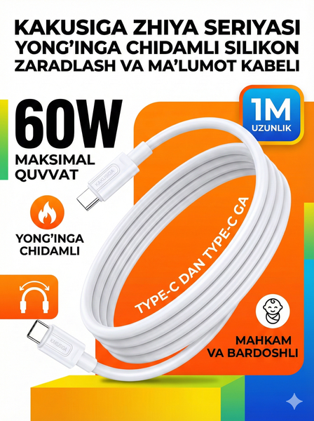 KAKUSIGA KSC-963 Type-C на Type-C USB кабель — это высококачественное и универсальное решение для быстрой и эффективной зарядки, а также для высокоскоростной передачи данных между вашими устройствами. Этот кабель разработан для современных гаджетов, поддерживающих интерфейс USB Type-C, обеспечивая максимальную совместимость и надежность. Благодаря своей прочной конструкции, он станет незаменимым аксессуаром как дома, так и в дороге. Кабель выполнен в стильном белом цвете, который идеально впишется в любой интерьер или дополнит ваш набор гаджетов. ✨ Основные характеристики: Интерфейс: USB Type-C на USB Type-C – обеспечивает двустороннее подключение и высокую производительность. Длина: 1.2 метра – оптимальная длина для удобного использования как вблизи розетки, так и с удаленным устройством. Скорость передачи данных: Поддерживает быструю синхронизацию файлов, видео и фотографий. Особенности: Прочная тканевая оплетка значительно увеличивает срок службы кабеля, предотвращая перегибы, заломы и разрывы. Позолоченные контакты обеспечивают стабильное и высококачественное соединение, минимизируя потери сигнала и коррозию. Экранированный кабель для защиты от электромагнитных помех. Цвет: Классический белый – универсальный и элегантный. Преимущества использования: ✅ Универсальность: Идеально подходит для зарядки и подключения смартфонов, планшетов, ноутбуков, внешних жестких дисков и других устройств с разъемом Type-C. ✅ Долговечность: Усиленная конструкция и качественные материалы гарантируют длительный срок эксплуатации даже при интенсивном использовании. ✅ Безопасность: Обеспечивает стабильную подачу тока, защищая ваши устройства от перепадов напряжения и перегрева. Не экономьте на качестве – выберите KAKUSIGA KSC-963 для надежной и быстрой работы ваших устройств! --- g ishonchli va tez ishlashi uchun KAKUSIGA KSC-963 ni tanlang!