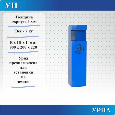 Урна УН - это напольная урна, предназначенная для установки на землю. Она выполнена из металла, что обеспечивает ей прочность и долговечность. Покрытие урны выполнено из электрополимера, что придает ей стильный и современный вид. Благодаря этому покрытию урна устойчива к воздействию погодных условий, а также легко очищается от грязи и пыли. Урна имеет прямоугольную форму и компактные размеры: высота - 80 см, длина - 20 см, ширина - 22 см. Это позволяет установить ее даже в ограниченном пространстве. Особенностью урны является отсутствие крышки, что делает процесс очистки урны более удобным. В комплекте поставляется одна урна. Урна УН выполнена в стильном сочетании синего и черного цветов, что позволяет ей гармонично вписаться в любой экстерьер. Вес урны составляет всего 7 кг, что делает ее легкой и удобной для перемещения. Выбирая урну УН, вы получаете стильный, функциональный и надежный аксессуар для вашего дома или офиса.