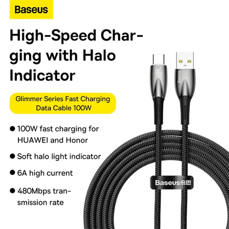 USB кабель BASEUS CADH000401 100W Glimmer, USB-A на Type-C, быстрая зарядка, 1м