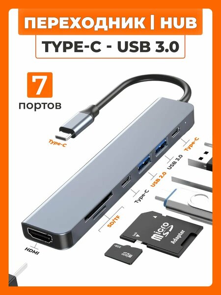 USB-концентратор с выходом Type-C для 7 входящих портов разных форматов: +4K UHD HDMI +Type-C PD в выходом до 100 ватт. +Type-C +HDTV +USB 3.0 +USB 3.0 +Слот для карт SD\TF. Особенности портов в хабе: 1.【Адаптер 4K USB-C/HDMI】: Отразите или расширьте экран с помощью адаптера USB C HDMI. Прямая потоковая передача макс. 4K HD с частотой 30 Гц. А также передавать потоковое видео Full HD 1080P или 3D на внешний дисплей HDTV, монитор или проектор. Перед покупкой убедитесь, что порт Type-C ноутбука поддерживает видеовыход USB-C. 2.【Type-C порт - Быстрая подача энергии】: Этот многопортовый адаптер USB C имеет один порт Type-C PD с высокоскоростной зарядкой мощностью 100 Вт, с помощью которого вы можете безопасно заряжать подключенный MacBook/Pro или другие совместимые ноутбуки Type-C и обеспечивать дополнительную мощность для жесткого диска и другого оборудования, подключенного к портам одновременно. 3.【Сверхскоростной USB 3.0 5 Гбит/с】: Концентратор USB C позволяет подключать жесткий диск, принтер, мышь, клавиатуру и другие USB-устройства к MacBook Pro/Air и передавать данные со скоростью до 5 Гбит/с. Обратная совместимость с устройствами USB 2.0. 4. 【Картридер для карт SD, TF и MicroSD】: Считыватель карт памяти для разных форматов SD, TF и MicroSD. Обратите внимание, что одновременно может читаться только одна карточка памяти. 5. 【Компактный дизайн】: Концентратор USB Type C компактен и легок. Алюминиевый корпус премиум-класса делает этот концентратор долговечным в использовании. Хаб с проводом тайпси для ноутбука - отличное решение для тех людей, которые пользуются множеством кабелей и большим количеством техники. USB порт подсоединяется к ноутбуку, компьютеру и даже блоку зарядки, что помогает одновременно восполнять емкость аккумулятора в нескольких смартфонах, переносить файлы с флешки. Гаджет выполнен из качественного металла, а его корпус — из алюминиевого сплава. Благодаря этому хаб выдерживает частое использование и механические повреждения.