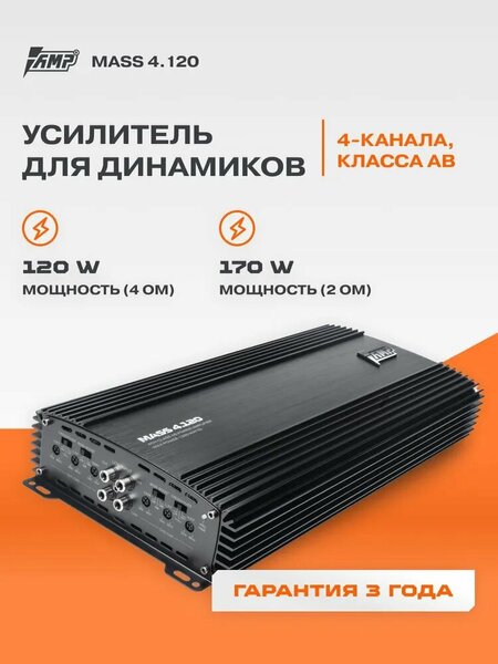 Усилитель AMP MASS 4.120 - это устройство, которое обеспечивает высокое качество звука в автомобиле. Он имеет 4 канала, что позволяет подключить к нему различные источники звука, такие как динамики, сабвуферы и другие аудиосистемы. Усилитель AMP MASS 4.120 обладает выходной мощностью на канал 120 Вт при сопротивлении 4 Ом и 170 Вт при сопротивлении 2 Ом. Это обеспечивает высокую мощность и качество звука даже при высокой нагрузке. Устройство работает в режиме класса A/B, что обеспечивает более чистое и детальное звучание. Мостовой режим позволяет увеличить мощность и улучшить качество звука. Усилитель оснащен защитой от короткого замыкания, перегрева и перегрузки. Индикатор защиты на корпусе устройства позволяет быстро определить причину неисправности и устранить ее. Устройство имеет режим усиления баса (Bass Boost) и фильтры ВЧ и НЧ, что позволяет настроить звук в соответствии с предпочтениями водителя. Усилитель поставляется в комплекте с усилителем, комплектом монтажных частей, инструкцией, упаковкой и гарантийным талоном. Размеры усилителя составляют 360 мм в ширину, 58 мм в высоту и 180 мм в глубину. Вес устройства составляет 5,5 кг. Усилитель AMP MASS 4.120 предназначен для работы при температуре окружающего воздуха от минус 15 °С до плюс 45 °С.