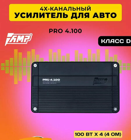 Четырехканальный усилитель от компании АМР серии PRO. Преимущество усилителя является их размер и работа в современном классе «Дж С КПД 80% дает малый нагрев и позволяет отдавать больше мощности. Компактный размер позволяет устанавливать усилителя практически в любое место в автомобиле. У усилителя PRO 4.100 высокое соотношение сигнал/шум, что обеспечивает комфортное прослушивание музыки на любой громкости, а также сводит на нет слышимые шумы при его работе. PRO 4.100 разработан для использования в системах класса SQ и SQ+. А тщательней контроль и применения лучших комплектующих позволяют держать высокую планку качества всех усилителей в серии Четырехканальный усилитель необходим для подключения четырех динамиков либо двух динамиков и одного сабвуфера.
