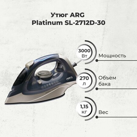 ARG Platinum делает процесс глажения более удобным и эффективным Утюг ARG Platinum SL-2712D-30 - это мощный и эффективный бытовой утюг, разработанный для обеспечения отличных результатов глажения. Утюг обладает мощностью 3000 Вт, что позволяет быстро нагреваться и гладить различные виды тканей, даже самые толстые и замятые. Наличие парового удара 260 г/мин, прибор способен эффективно справляться с складками и морщинами на одежде, делая процесс глажения быстрым и легким. Наличие функции автоматического отключения обеспечивает безопасность при использовании утюга. Утюг оснащен противокапельной системой, которая предотвращает вытекание воды из утюга на ткань при низкой температуре. Это помогает избежать образования пятен на одежде.
