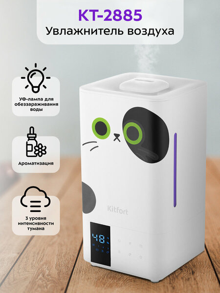 Ультразвуковой увлажнитель воздуха KT-2885 увлажняет воздух в помещении, создавая хороший микроклимат для проживания людей. Данная модель увлажнителя воздуха имеет функции ионизации и теплого тумана, а также автоматический режим. Есть возможность установить таймер отключения от 1 до 10 часов с шагом 1 час и выбрать один из трех уровней интенсивности тумана. На дисплее отображается влажность в помещении. Также устройство оповестит вас, если вода в резервуаре закончится. Увлажнитель оснащен ультрафиолетовой лампой с длиной волны 270–285 нм для обеззараживания воды. Она имеет высокую обеззараживающую эффективность по отношению к бактериям и вирусам. В увлажнитель встроен нагреватель, который нагревает воду в основании, и из увлажнителя выходит теплый туман. При включении функции «Теплый туман» увлажнение воздуха происходит быстрее. Также в процессе нагревания воды погибают некоторые бактерии и вредоносные микроорганизмы. В автоматическом режиме увлажнитель работает на минимальном уровне интенсивности до тех пор, пока уровень влажности не достигнет заданного значения. Когда уровень влажности понизится, увлажнитель снова начнет работать. Вы можете установить уровень влажности от 40% до 70% с шагом 5%. Резервуар для воды съемный, поэтому его удобно наполнять водой. В резервуаре увлажнителя расположен фильтр, благодаря которому вода очищается от содержащейся в ней грязи и пыли. КТ-2885 простой в эксплуатации и обслуживании, отличается высокой надежностью в работе. Может использоваться в помещениях, площадь которых не превышает 50 м². Управлять увлажнителем можно с помощью сенсорных кнопок на основании увлажнителя или с помощью пульта дистанционного управления. В приборе предусмотрена функция ароматизации: достаточно пропитать губку ванночки для ароматизации эфирным или аромамаслом. Во время работы увлажнителя ароматическое вещество будет испаряться и вместе с туманом выдуваться наружу потоком воздуха. Ультразвуковые увлажнители считаются наиболее эффективными среди существующих увлажнителей воздуха. Принцип работы такого увлажнителя прост. Внутри него стоит пьезокерамический излучатель, погруженный в воду, который с помощью ультразвуковых колебаний выбивает с поверхности воды мельчайшие капельки воды, создавая водяной туман. Этот туман выдувается наружу небольшим вентилятором, а затем разносится по объему помещения естественными воздушными потоками. Частицы тумана мелкие, они обладают большой суммарной поверхностью, а потому быстро испаряются, что приводит к повышению относительной влажности воздуха. Согласно действующим российским стандартам для нормального самочувствия человека относительная влажность воздуха в жилых помещениях должна быть в пределах от 45% до 65%. Чем плох сухой воздух? Если человек постоянно находится в помещении с сухим воздухом, то постепенно возникают негативные эффекты: ухудшается внимание, растет утомляемость, снижается общий иммунитет. Сухой воздух отрицательно воздействует на слизистые оболочки носоглотки, снижая их способность защищать организм от простудных инфекций. Возникает сухость в горле и в носу, кашель, затрудненное дыхание. Постоянное воздействие сухого воздуха может нарушить работу всей дыхательной системы, способствуя развитию астмы и других болезней дыхательных 
