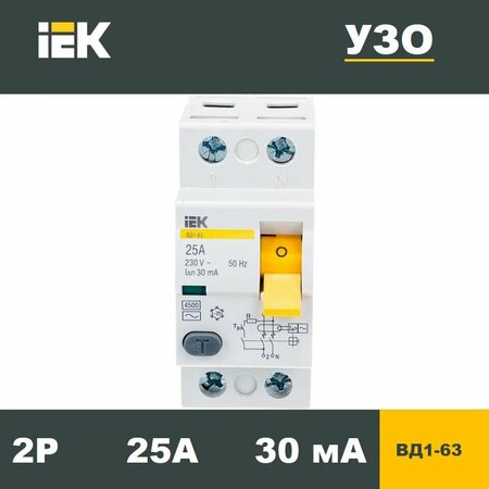 УЗО 25А -быстродействующий защитный выключатель, реагирующий на дифференциальный ток, без встроенной защиты от сверхтоков. Выключатель дифференциальный предназначен для защиты человека от поражения электрическим током при случайном непреднамеренном прикосновении к токоведущим частям электроустановок и предотвращает возникновение пожаров вследствие протекания токов утечки на землю. УЗО IEK не имеет собственного потребления электроэнергии и обладает высокой механической износостойкостью.