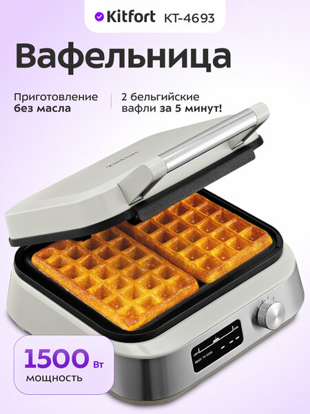Аппетитные вафли за считанные минуты! С помощью вафельницы КТ-4693 вы сможете испечь 2 бельгийские вафли за один раз. Разнообразные рецепты этого лакомства и простота приготовления сделают ваши завтраки самыми вкусными. 5 минут и золотистые вафли готовы! Простой принцип работы Поворот регулятора включает и выключает прибор; а также изменяет ступень времени приготовления от «1» до «5», вафли готовятся от 2 до 5 минут. В левой части дисплея отображается текущая стадия работы. По краям панели находится отсек для излишков теста. Лёгкая чистка и вафли без масла Антипригарное покрытие панелей вафельницы не даст прилипнуть тесту в процессе приготовления и позволяет готовить с минимальным количеством масла. Также антипригарное покрытие облегчает чистку панелей. Вафли для всей семьи! Электрическая вафельница КТ-4693 — идеальный выбор для любителей вкусных и ароматных вафель. Современный дизайн и компактные размеры позволяют легко разместить вафельницу даже на небольшой кухне.