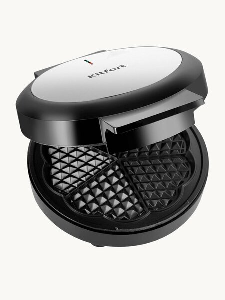 Лёгкий и вкусный завтрак С помощью электрической вафельницы КТ-5609 вы можете печь вафли в форме цветка, которые при желании можно разделить на пять маленьких вафель в форме сердечка. Вафельница рассчитана на приготовление одной вафли в форме цветка. Индикаторы нагрева и питания Индикатор питания горит, когда прибор включен в сеть. Индикатор нагрева горит, пока панели разогреваются. Когда панели достигли нужной температуры, индикатор гаснет. Антипригарное покрытие Антипригарное покрытие панелей вафельницы не даёт тесту прилипнуть в процессе приготовления и позволяет готовить с минимальным количеством масла. Также антипригарное покрытие облегчает чистку панелей. Надёжный помощник на кухне Вафельница КТ-5609 мощностью 1000 Вт имеет прочный пластиковый корпус с противоскользящими ножками. Корпус и крышка сильно нагреваются, возможен выход пара. Открывайте и закрывайте крышку только за ручку во избежание ожогов.