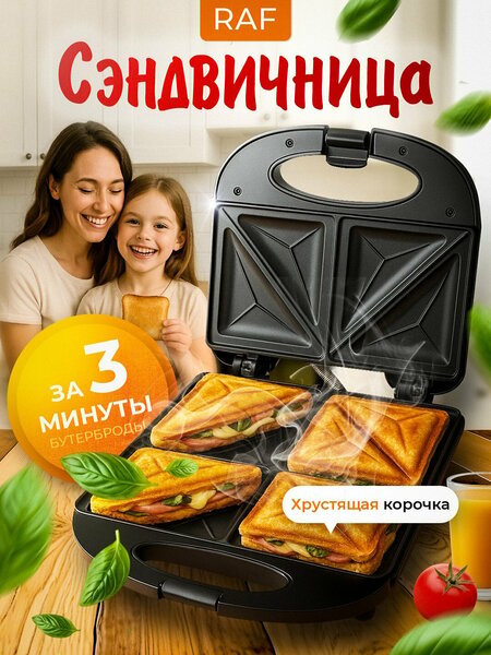 важно При первом включении мультипекаря возможно появление запаха — это нормально. Происходит первичное обгорание заводских нагревательных элементов. Запах исчезнет через короткое время. Основные характеристики: Защита от перегрева — устройство безопасно в использовании. Безопасное покрытие — не выделяет вредных веществ при нагревании. Удобство ухода Все панели — антипригарные, легко очищаются. Не требуют большого количества масла. Особенности приготовления Готовит до 4 тостов или бутербродов одновременно. Идеальна для тостов с начинкой: хрустящая корочка, равномерная прожарка с обеих сторон. Рифленые пластины создают золотистые полоски на хлебе. Независимые нагревательные элементы в каждой половине формы. Управление — простое и интуитивно понятное. В комплекте: сменные панели — легко устанавливаются и моются. Эргономика и хранение Корпус из термостойкого пластика — не нагревается, безопасен. Эргономичная ручка не обжигает. Устойчивые резиновые ножки — не скользит на столе. Можно хранить вертикально — экономит место. ✅ Итог RAF R201 — надежное, удобное, функциональное устройство для дома. Подходят для всей семьи и сделают вашу кухню комфортной и современной.