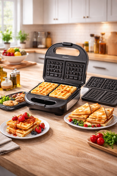 Sonifer SF-6166 — многофункциональная кухонная техника «3 в 1», объединяющая сэндвичницу, вафельницу и гриль в одном компактном приборе. Он создан для быстрого и лёгкого приготовления разнообразных блюд дома — от хрустящих вафель до горячих сэндвичей и сочных гриль-закусок. Мощность: около 1000 Вт, что обеспечивает быстрый разогрев и стабильное поддержание температуры. Сменные панели: прибор комплектуется сменными панелями для разных режимов: панели для вафель панели для сэндвичей панели для гриля Антипригарное покрытие на панелях облегчает приготовление и очистку — продукты не прилипают, а очистка занимает минимум времени. Корпус выполнен из термоустойчивого материала (пластик + металл), который не нагревается снаружи во время работы. Световой индикатор нагрева/готовности уведомляет, когда можно заливать тесто или выкладывать продукты. Компактные габариты и небольшой вес (≈1,3 кг) делают прибор удобным для хранения в любом кухонном шкафу. Защита от перегрева добавляет безопасности при использовании. Основные преимущества: Универсальность — три функции в одном приборе. Быстрый и равномерный нагрев. Простота в использовании и уходе. Компактный дизайн.