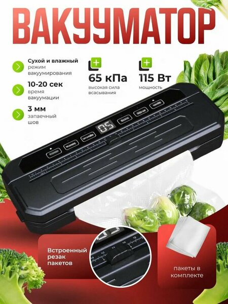 Вакууматор для продуктов — это незаменимый прибор для тех, кто хочет сохранить свежесть продуктов на длительное время, благодаря мощности в 110 Вт и силе всасывания 65 кПа, устройство эффективно удаляет воздух из упаковки, предотвращая окисление и порчу продуктов. Этот процесс особенно полезен для хранения мяса, рыбы, овощей и других скоропортящихся продуктов, так как вакуумирование помогает сохранить их вкус и текстуру. Ключевым преимуществом вакууматора является быстрое время вакуумации, которое составляет от 10 до 20 секунд, это позволяет значительно ускорить процесс упаковки, что особенно удобно при приготовлении порционных заготовок для длительного хранения или заморозки. Вакууматор поддерживает два режима работы — сухой и влажный, что делает его универсальным решением для различных типов продуктов. В сухом режиме прибор идеально подходит для вакуумирования сыпучих продуктов, таких как орехи, кофе, сухофрукты и крупы, а влажный режим предназначен для упаковки продуктов с высоким содержанием жидкости, например, маринованного мяса или овощей. Дополнительное удобство при использовании вакууматора обеспечивает встроенный резак пакетов, с его помощью можно легко и точно отрезать нужный размер пакета без необходимости использования ножниц. Это делает процесс упаковки более удобным и быстрым. Кроме того, устройство обладает простым управлением, что позволяет пользоваться им без дополнительных сложностей даже тем, кто впервые сталкивается с вакуумированием продуктов. Вакуумный упаковщик идеально подходит для тех, кто хочет продлить срок хранения продуктов, избежать образования льда при заморозке и сохранить их первоначальную свежесть. Благодаря современному дизайну и компактным размерам, прибор легко размещается на кухне и занимает минимум места.