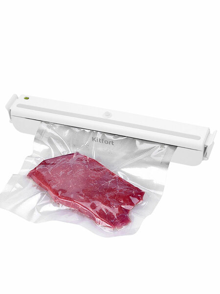 Увеличивает сроки хранения Вакууматор Kitfort КТ-1505 - современный прибор, призванный увеличить сроки хранения пищевых продуктов. Продукты, упакованные под вакуумом, сохраняют свежесть и не портятся существенно дольше по сравнению с обычными условиями хранения. Управление в одно нажатие Прибор может работать в двух режимах. При нажатии кнопки вакууматор автоматически откачивает воздух из пакета, а затем запаивает его. А с помощью опции Пайка устройство запаяет пакет без вакуумирования. Надёжные фиксаторы крышки Для надежности у вакууматора по бокам установлены фиксаторы, которые закрепляют положение крышки при выкачивании воздуха. Бережная упаковка С помощью устройства можно вакуумировать сухие и влажные продукты. В таком случае, если пища не переносит сильного сдавливания, можно воспользоваться кнопкой Включения/выключения, чтобы прервать процесс откачивания воздуха в любой момент. Выпускаем воздух На вакууматоре установлен специальный клапан напуска воздуха. С его помощью вы можете выпустить воздух внутрь контейнера уже после вакуумирования продуктов. Комплектация Приятным дополнением станет функция откачивания воздуха из контейнеров при помощи шланга, а вакуумные пакеты и рулон вакуумной плёнки помогут сохранить свежесть продуктов и их приятный аромат в течение длительного времени. Характеристики: Максимальная ширина пакета для вакуумирования: 29 см Создаваемое разрежение: 0,6 бар Мощность: 85 Вт Напряжение: 220240 В, 50/60 Гц Размер устройства: 380 х 50 x 55 мм Размер упаковки: 395 х 90 х 90 мм Длина шнура: 1,1 м Вес: 0,5 кг Вес брутто: 0,7 кг